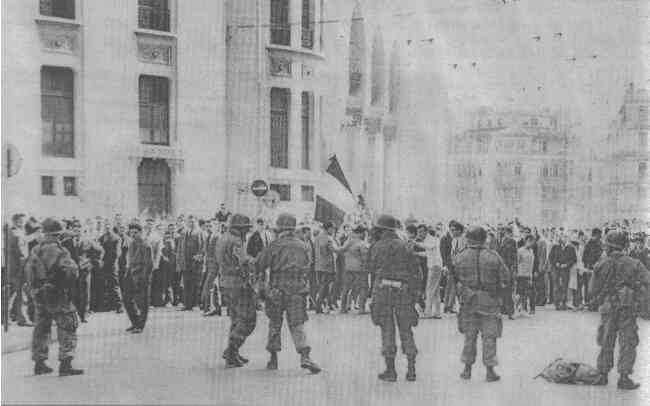 N.D.L.R. : On remarquera, l'attitude belliqueuse des manifestants qui a justifié la boucherie ordonnée par Charles de Gaulle 1er