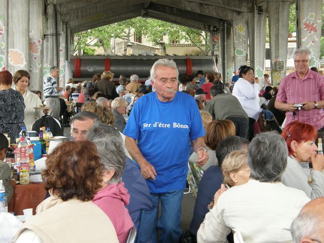Cette année, que le mois de juin jaloux, y veut bessif ressembler au mois de mars que nous z'aut', on sait que c'est le mois des fous, le rassemblement annuel des bônois y s'a pas tenu à Uzès comme d'habutude à cause la pluie. Y s'a tenu à Saint-Quentin la Poterie (ça y est, t'y es content ?) et là, dessous un hangar (eh non ! diobône, pas une gare, où c'est que t'y as vu le train ?) y avait qu'à même du monde mais pas le monde fou qu'y a d'habutude pasque, y en a, les pauv', à cause la pluie qu'elle tombait averse, y z'ont eu peur de se mouiller et leur peur, elle leur a venue à bou blèche à pasqu'on a qu'à même eu le soleil dessur la tête et en dedans les cœurs.