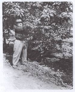 Maurice VERNEDE, son gendre, né en 1908 à Randon dans l'allée de l'entrée du jardin bordée de kumquats et de néfliers du Japon.