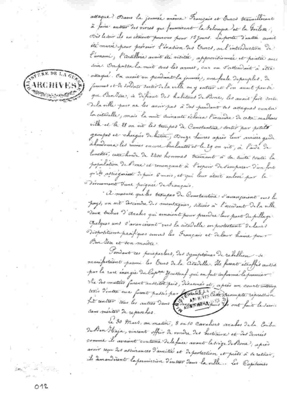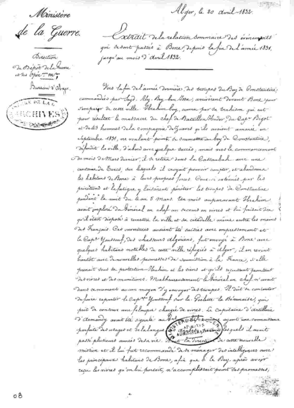 EXTRAIT de la relation sommaire des événements qui se sont passés à Bône, depuis la fin de l'année 1831 jusqu'au mois d'Avril 1832.