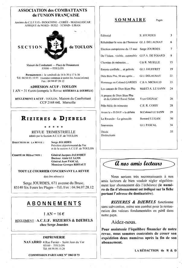 RIZIERES et DJEBELS de l'A.C.U.F. au Prix de 16 Euros l'abonnement