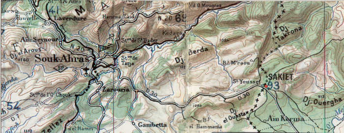Cette voie plein ouest vers l'intérieur de l'Algérie passe au nord de Guelma, petite cité dans une cuvette, riche de ses ruines romaines et de ses cultures de tabac. Guelma sera à la bataille nord du barrage ce qu'a été Tébessa au sud.