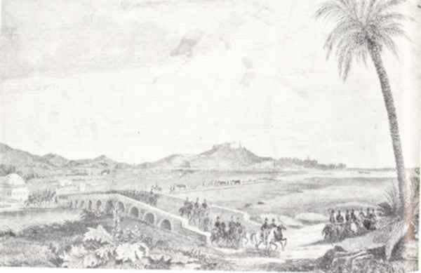 La tête de la Colonne vient de déboucher sur la route de Guelma, tout près d'un haut palmier qui s'incline vers la rivière après la sortie du pont.