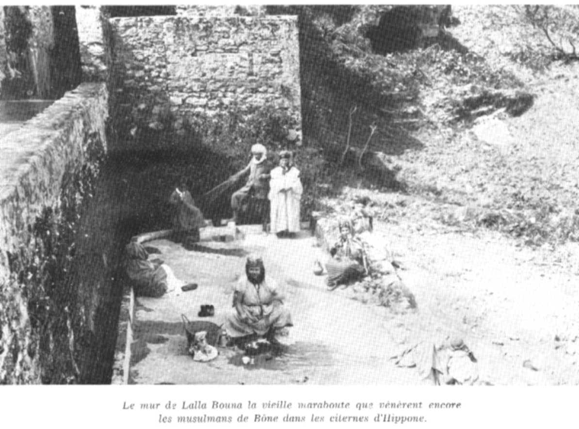 On dit d'ailleurs que les indigènes désignaient sous le vocable « Lalla Bouna », que l'on peut traduire « Celle d'Hippone », Monique, la mère de Saint-Augustin, qu'ils auraient eu en grande estime, ou, peut-être, car Monique ne serait jamais venue à Hippone, une autre femme, Maraboute vénérée, qui serait enterrée dans les ruines des citernes et dont on révère encore le souvenir.