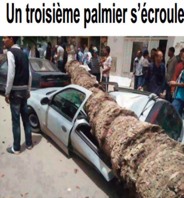 Les palmiers qui faisaient le charme d'Arzew, s'effacent du paysage l'un après l'autre, sous les yeux des riverains. En effet, les intempéries de cette saison d'hiver passé, n'ont pas cessé de faire des dégâts à Arzew. Après deux premiers palmiers qui s'étaient écroulés quelques temps auparavant dans la ville d'Arzew, un autre palmier, de plus d'une vingtaine de mètres est tombé sur un véhicule de marque Renault Clio, au niveau de la même place publique. Le drame s'est produit, en plein jour, causant ainsi ce dégât incommensurable et comme dit l'adage '' y a pas photo''.