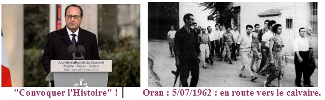 - Celle du 19 mars 1962 avec des accords honteux de cessez-le-feu qui a sonné la mort de milliers d'hommes et de femmes en Algérie après cette date. La honte suprême est la présence en 2016 du président français, M. F. Hollande à cette manifestation où il a tué une nouvelle fois toutes les victimes de l'après 19 mars. Cela a déclenché des milliers de lettres de protestation et de désapprobation où même une voix militaire se fait entendre de plus en plus fort, celle du Général Martinez. Est-ce le salut ???