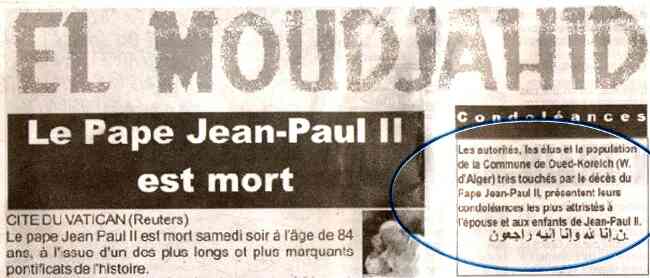 Les journaux : une certaine liberté, une certaine critique …. plusieurs journaux nationaux en français et en arabe. Le journal local est l'EST républicain. Petites annonces matrimoniales instructives ; plusieurs annoncent :'' recherche un conjoint vivant à l'étranger ou binational, de préférence ayant les yeux bleus ''….. je tiens les journaux à votre disposition. Lu aussi dans ce journal du 30 avril 2005 : '' le Président ( Boutéflika ) a pris la décision d'en finir avec la ( la fausse …) légitimité historique et révolutionnaire '' …… ''les moudjahidines dont le nombre avoisinait les 60 000 au lendemain de l'indépendance, se retrouvent aujourd'hui aux environs de 950 000''…..pour bénéficier de " petites faveurs ".
