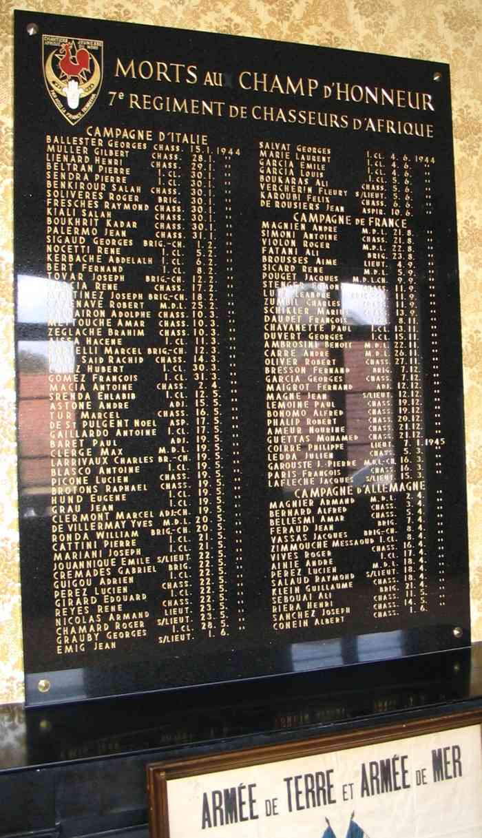 A la demande de la famille d’un disparu je recherche toute information concernant un Cavalier du 7ème Régiment de Chasseurs d’Afrique dont le nom est gravé sur la plaque commémorative, apposée dans l’Hôtel de Ville de Esprels (70), rappelant le séjour du Régiment – du moins de l’Etat-major et du 1er Escadron – en octobre 1944 (voir photographie du monument jointe - en bas et à droite - dernière ligne).