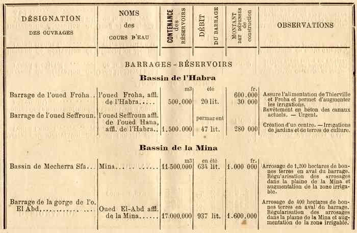 En ce qui concerne les barrages de l'oued Froha et de l'oued Sefroun, nous avons fait connaître, en raison de leur situation dans le bassin de l'Habra, les avantages et les inconvénients qui résulteraient de leur établissement, nous pensons néanmoins qu'ils doivent être conservés au programme, dussent-ils être placés au dernier rang. Quant à ceux que nous proposons de construire sur la Mina et l'oued El-Abd, ils seront une source de fertilité et de bien être non seulement dans la contrée où ils seront établis, mais encore dans la vaste plaine de la Mina dont ils garantiront la richesse et la prospérité. Il convient dès lors de les placer au premier rang.