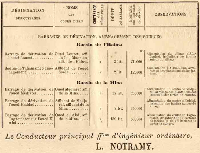 Elles pourraient être employées en partie à l'alimentation du village de Haddad de 80 feux, projeté sur la rive gauche de l’oued Haddad à 17 kilomètres de Cacherou, sur le chemin qui relie ce centre au barrage de Fortassa ; le surplus serait utilisé aux irrigations autour du village. Leur emploi nécessiterait la construction d'un barrage de dérivation de 20 mètres de longueur et de 9 m. 50 de hauteur au dessus du lit du ravin, l'établissement d'un canal maçonné de 1,500 mètres de longueur et des rigoles d'irrigation dont la dépense s'élèverait à 30,000 francs.