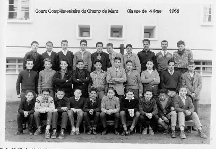 Champs de Mars - 4ème- 1954 1 Julien Di Benedetto - 2 ? - 3 ? - 4 ? - 5 Allouche - 6 ? - 7 ? - 8 ? - 9 ? - 10 Soulier Jacques - 11 Ruiz - 12 ? - 13 Felice - 14 ? - 15 Razza - 16 ? - 17 ? - 18 Bonici - 19 Bracal - 20 Campéglia - 21 Donadieu - 22 ? - 23 ? - 24 ? - 25 ? - 26 ? - 27 ? - 28 Ernest Gonzalez - 29 ? - 30 Francis Azzopardi - De haut en bas et de droite à gauche Photo envoyée par M. Julien Di Benedetto |